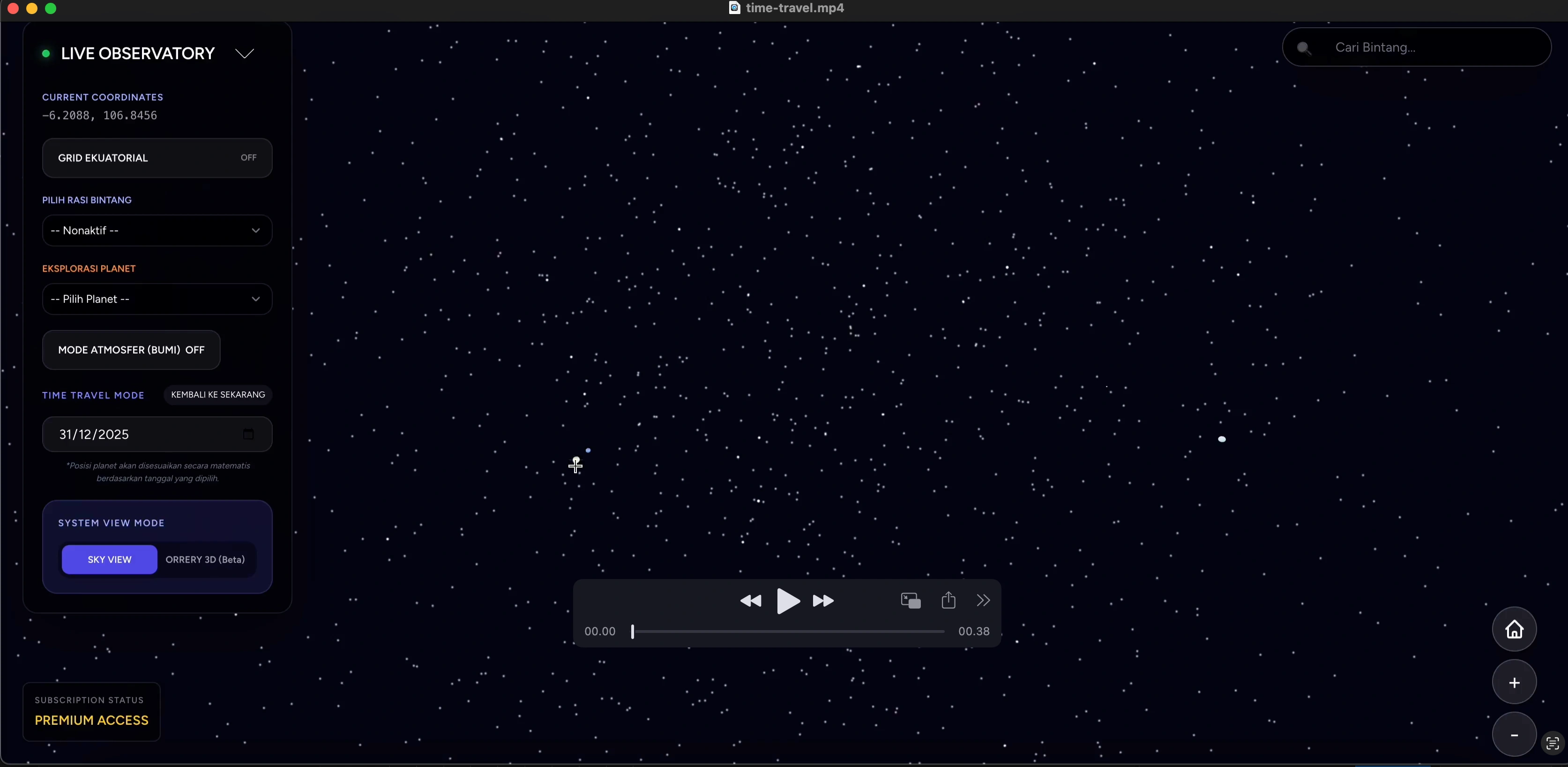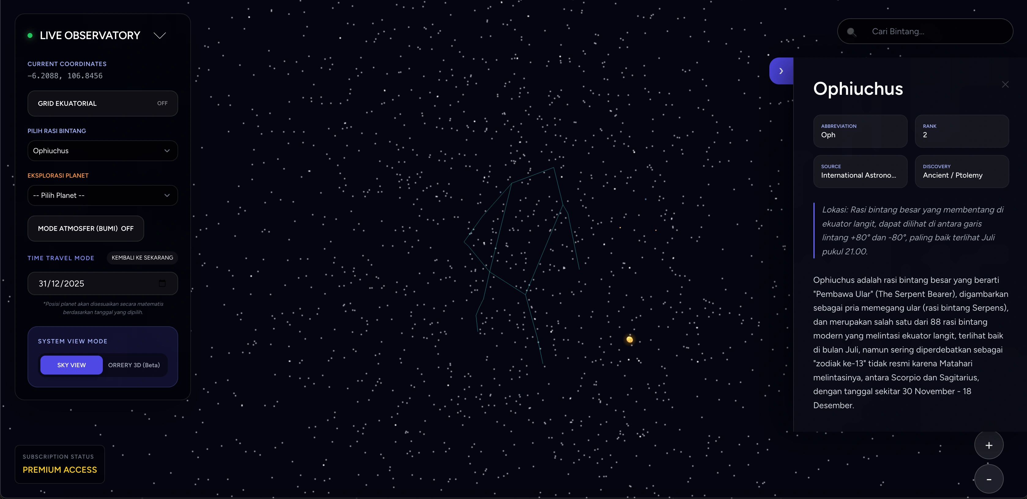 Observatorium digital paling presisi dengan 9.000+ bintang, simulasi planet real-time, dan perjalanan waktu astronomi. Jelajahi keindahan semesta kapan saja, di mana saja.