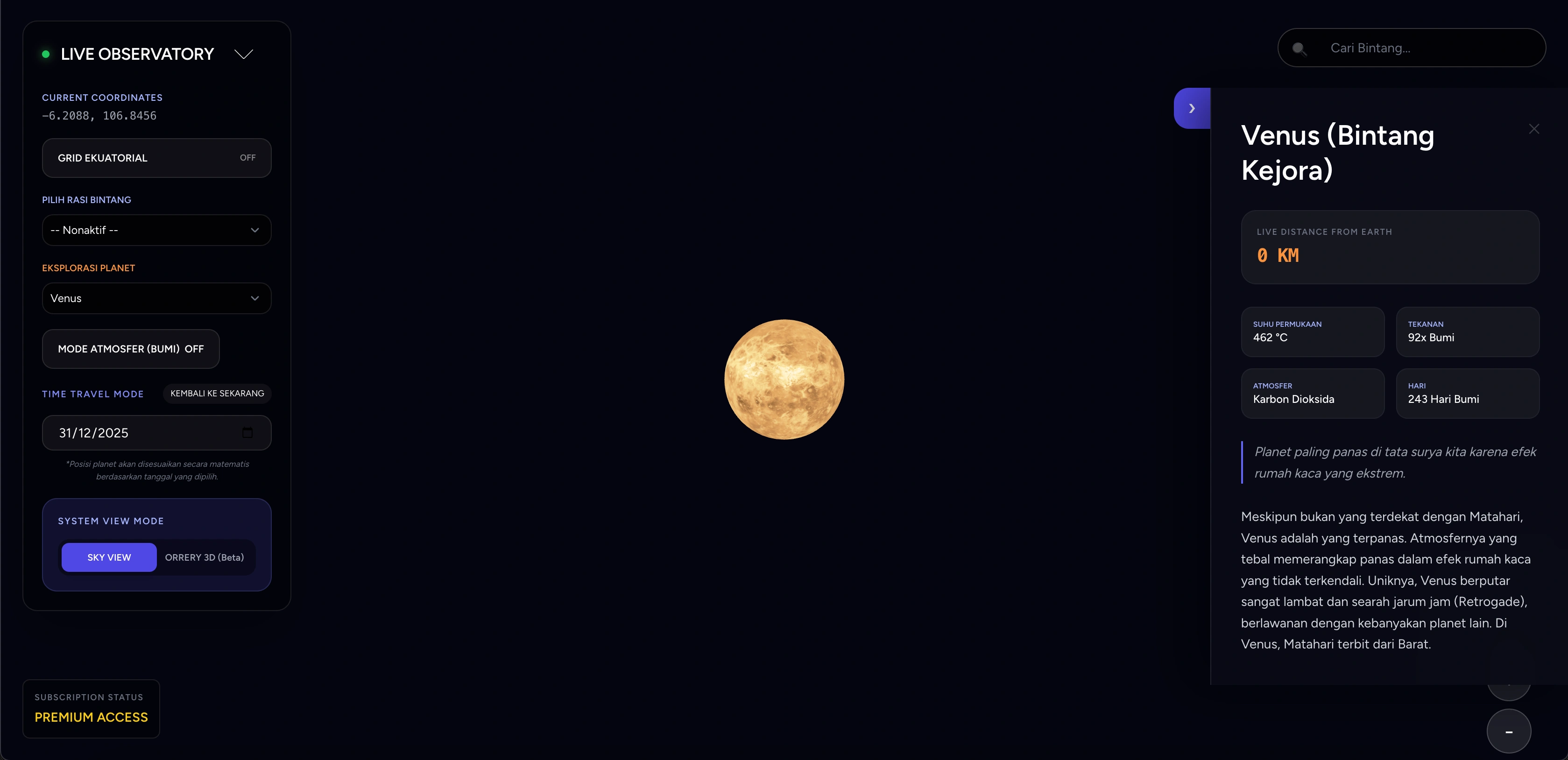 Observatorium digital paling presisi dengan 9.000+ bintang, simulasi planet real-time, dan perjalanan waktu astronomi. Jelajahi keindahan semesta kapan saja, di mana saja.